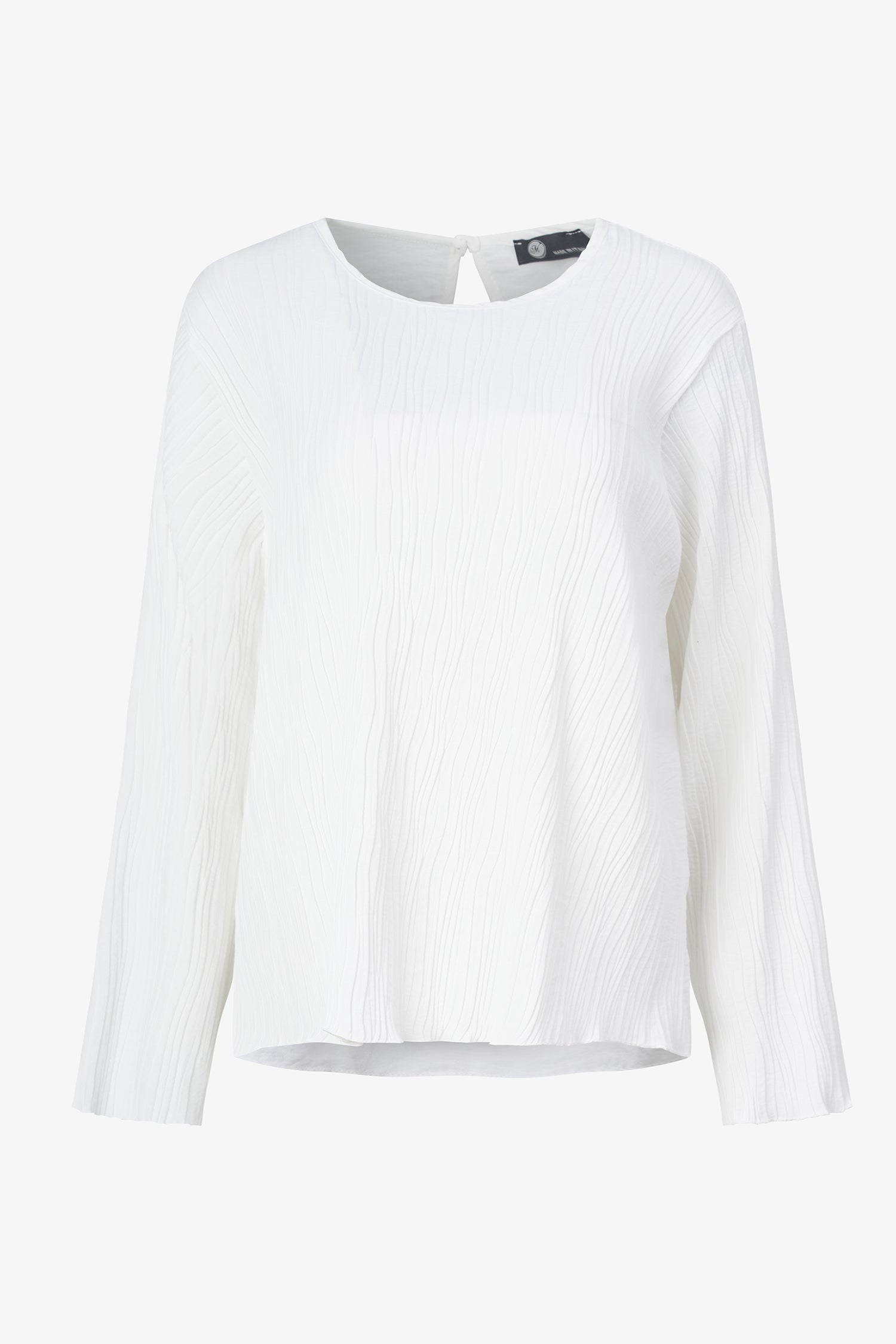 Haut ras du cou tissé à manches longues pour femme, avec fermeture boutonnée et détail trou de serrure au dos (devant et manches texturés, dos non texturé). 100 % polyester.