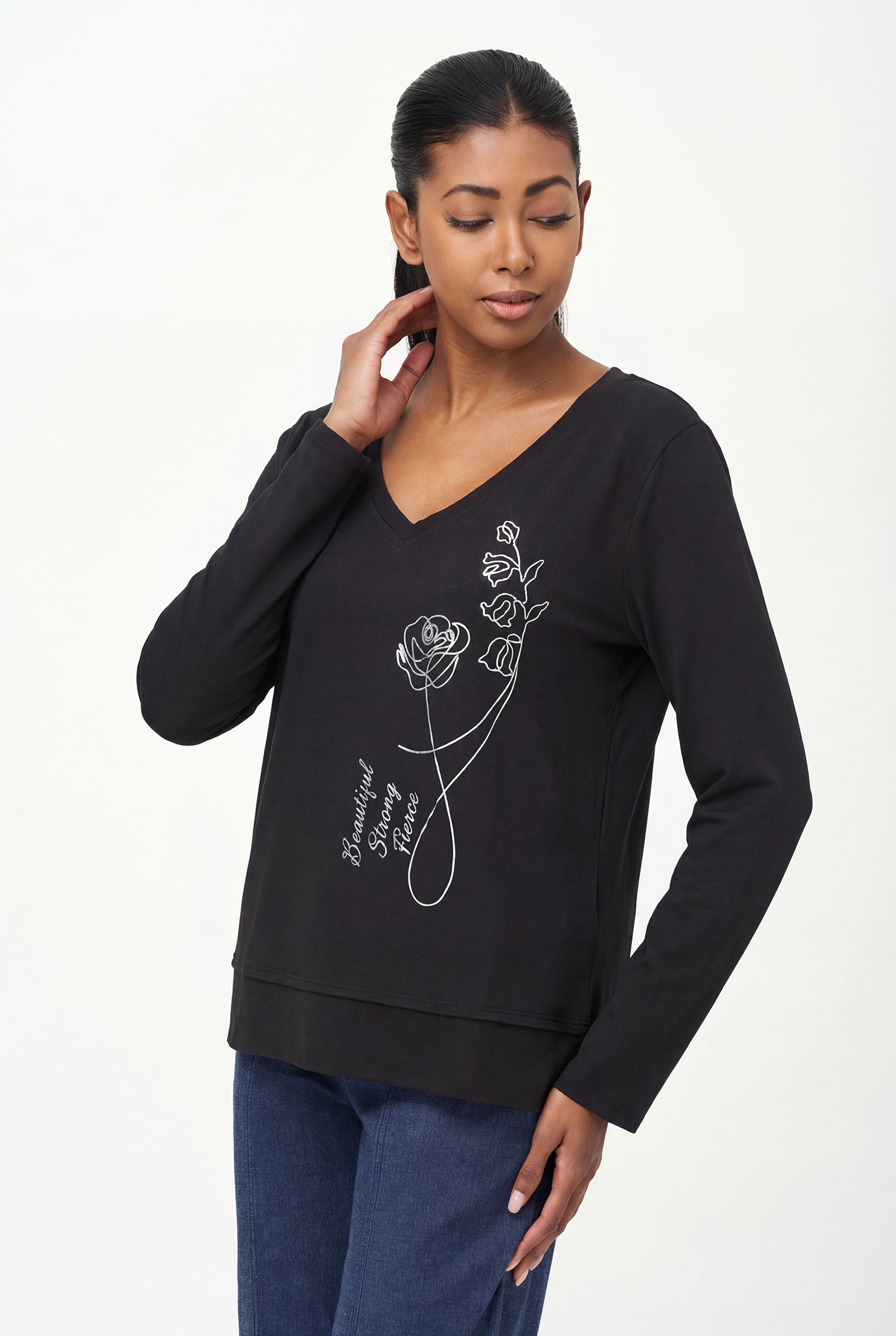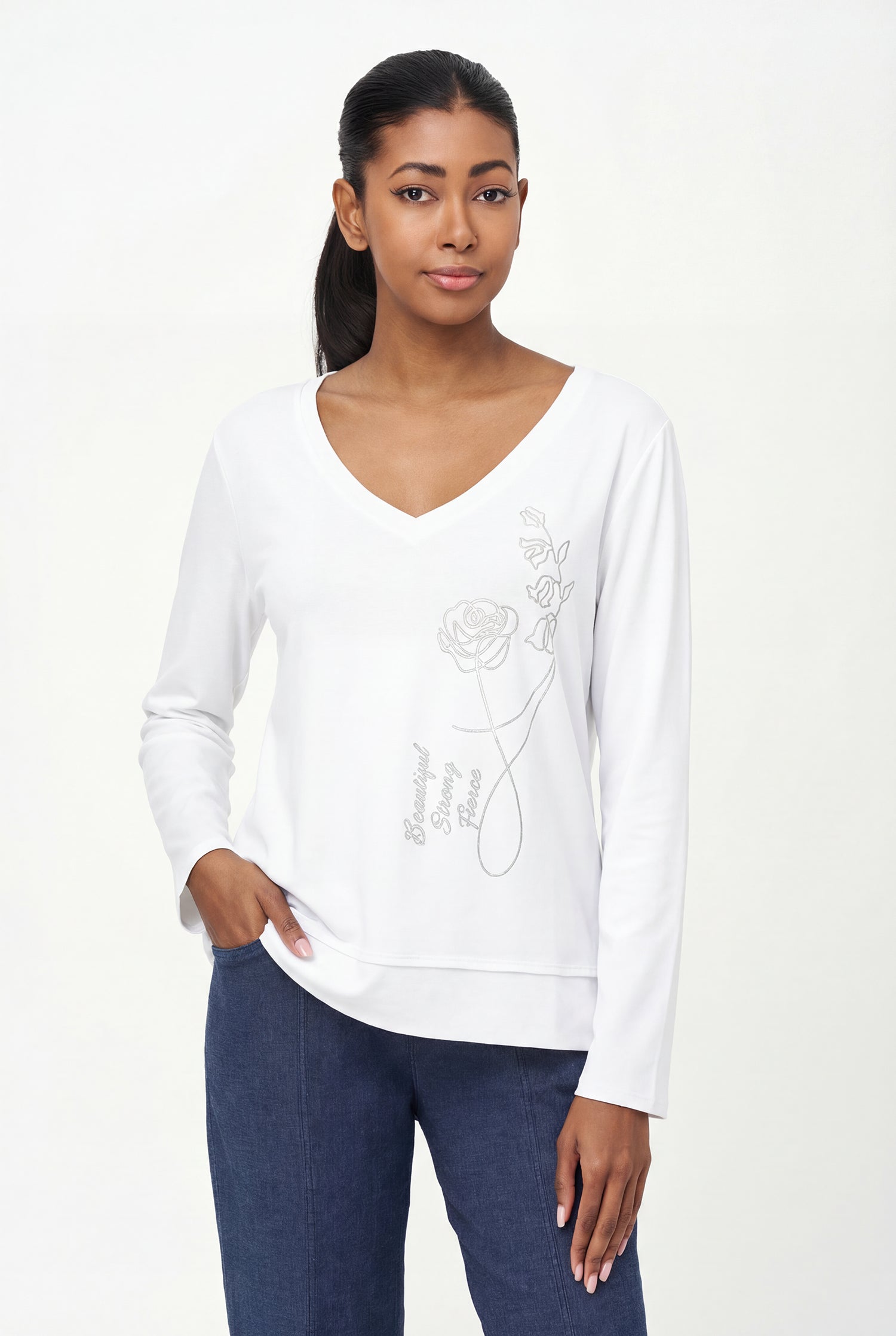 Haut en tricot à manches longues et col en V pour femme, avec ourlet irrégulier et imprimé placé. 95 % coton, 5 % élasthanne.
