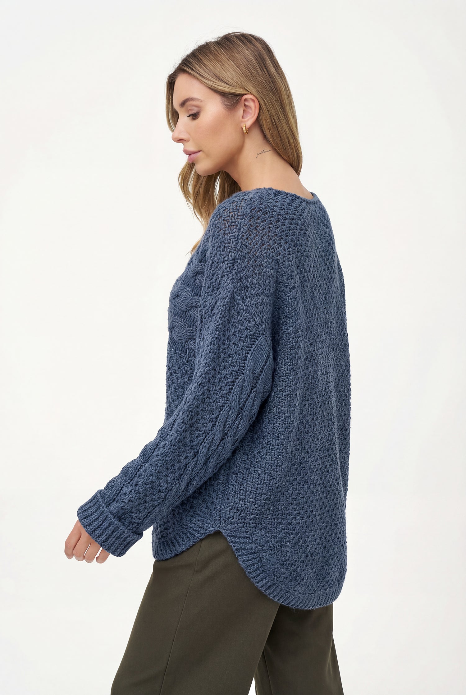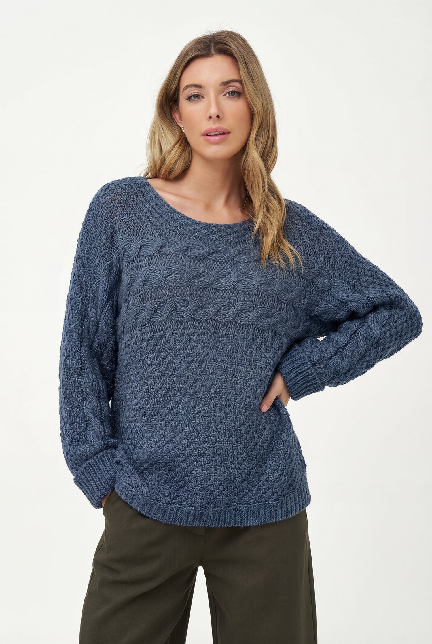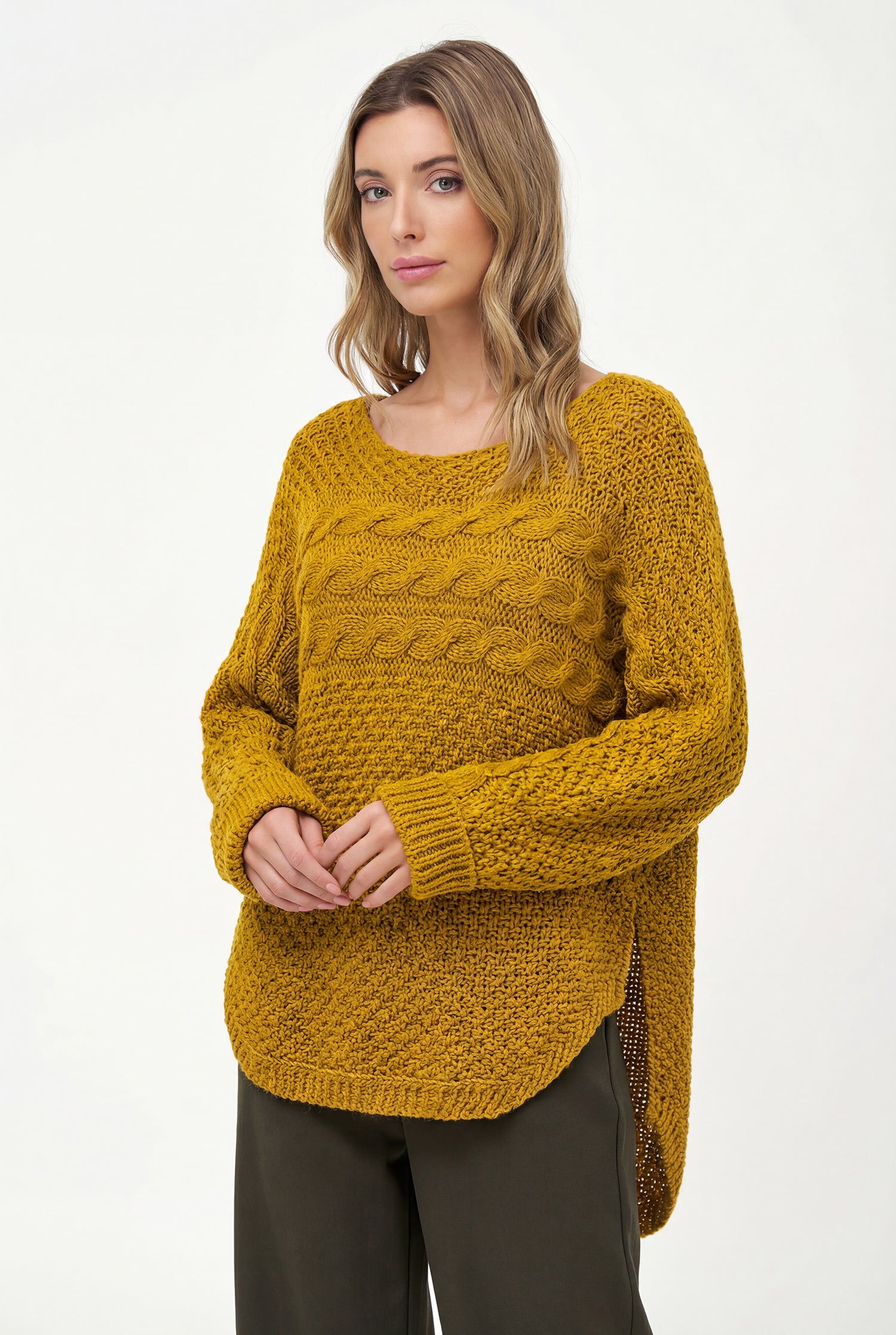 Pull femme en maille torsadée à col large, manches longues et ourlet asymétrique. 50 % acrylique, 20 % polyamide, 10 % mohair, 10 % viscose et 10 % laine.